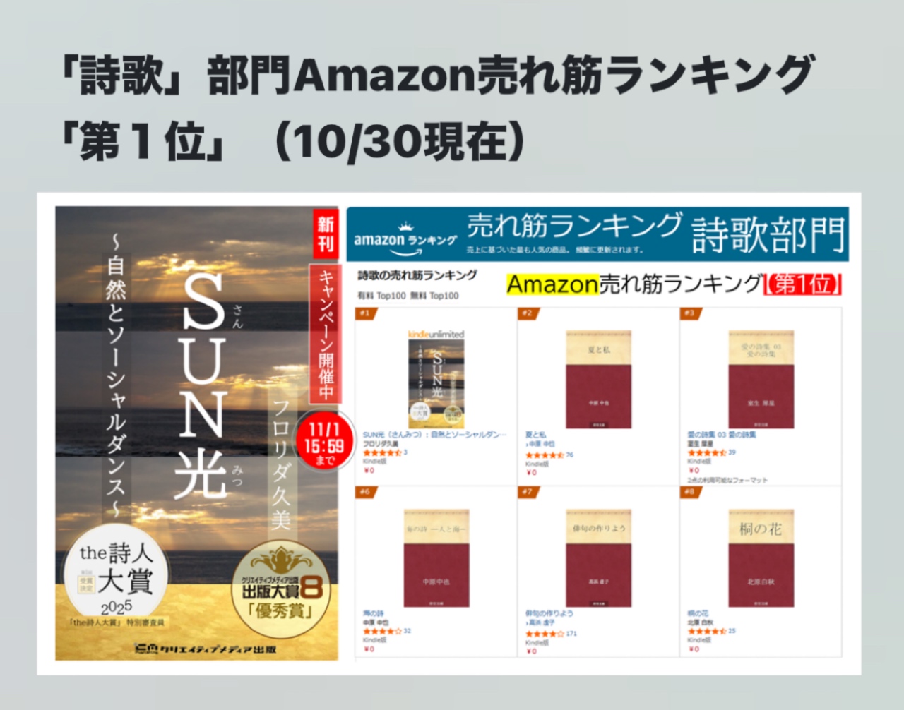 こんばんは!作家(the 詩人大賞特別審査員)・ラジオパーソナリティのフロリダ久美です。 まずは、10月27日発売*写真・詩集『SUN光(さんみつ)』~自然とソーシャルダンス~が、「詩歌」部門 でも、Amazon売れ筋ランキング「1位」獲得!皆様の応援、本当に本当にありがとうございます。感謝♡感謝です。 ↓ 2025年11月1日の『SUN光』@神奈川県小田原市 海を見ながら、今日から11月のはじまり、はじまり~☆ ふと、「the詩人大賞」『SUN光(さんみつ)』の企画・・・ 確か、去年の今頃だったような?! ↓じゃーん!!!! なんと!ちょうど1年前の今日!2024年11月1日に、お台場のオフ […]