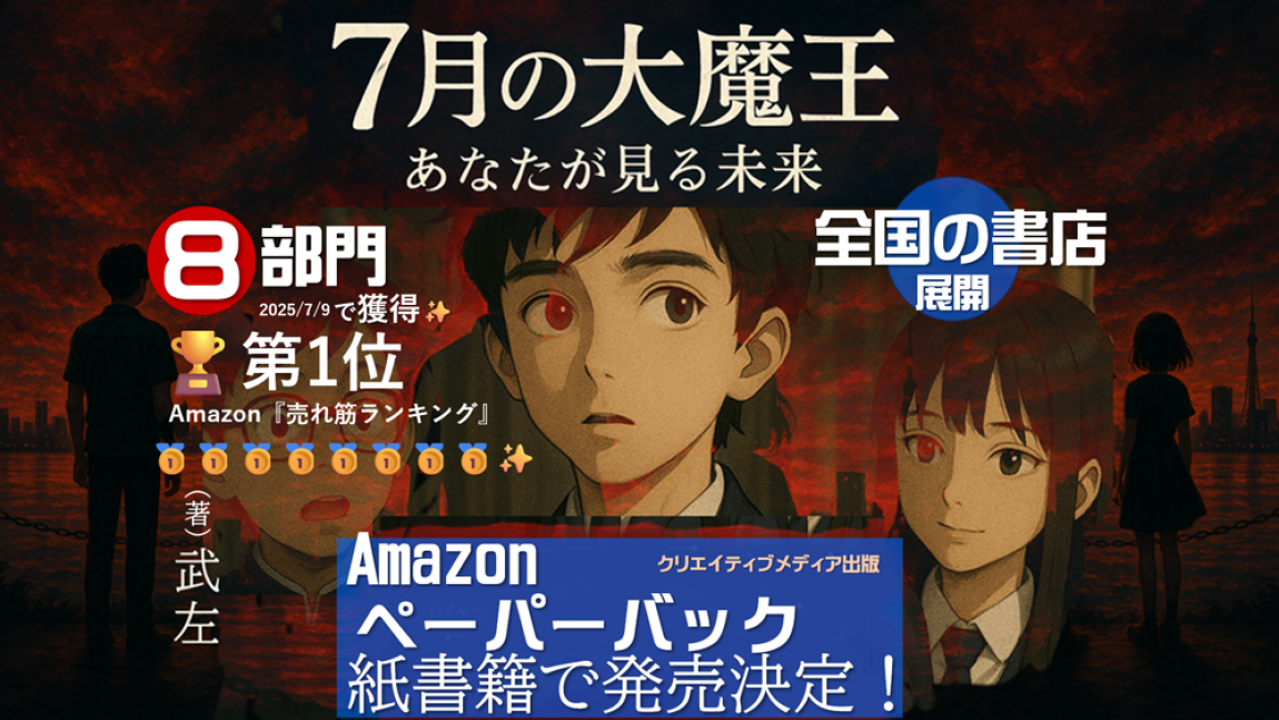 今話題の「2025年7月5日」。トカラ列島では群発地震が続く中、クリエイターズワールド連載中の作品の地震予言「運命の7月5日」7月の大魔王~あなたが見る未来~著:武左(タケヒダリ)が本日、AmazonKindle出版で緊急発売となりました。